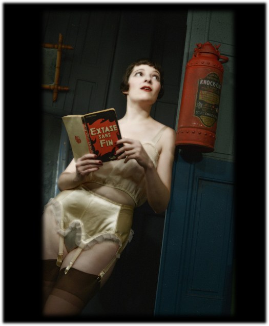 « Le jupon de toile laisse entrevoir des jarretelles brunes ; les chevilles d’oiseau disparaissent sous des jambières de laine foncée qui tombent par-dessus les sabots. La robe est bleue, usée, ample, retenue à la taille par un ruban fuchsia ; la manche glisse sur l’épaule, dévoile la dentelle rose thé des dessous. »