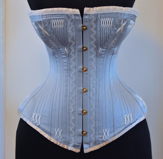 Le corset original date de la fin des années 1870 et appartient au Boston Museum of Fine Arts. Alexander Chesebro a eu l’occasion de l’examiner sur place, afin d’en relever le patron et d’étudier les différentes techniques utilisées pour sa construction, qu’il nous a transmises durant le cours. La photo ci-dessus est une reproduction qu’il a faite.
