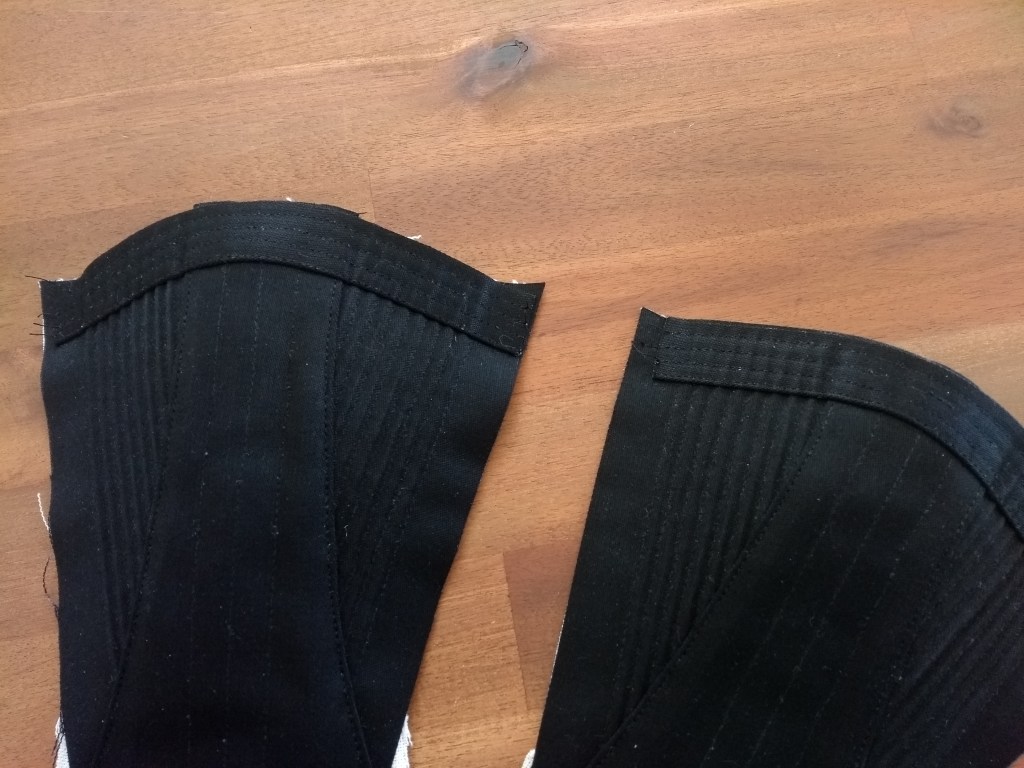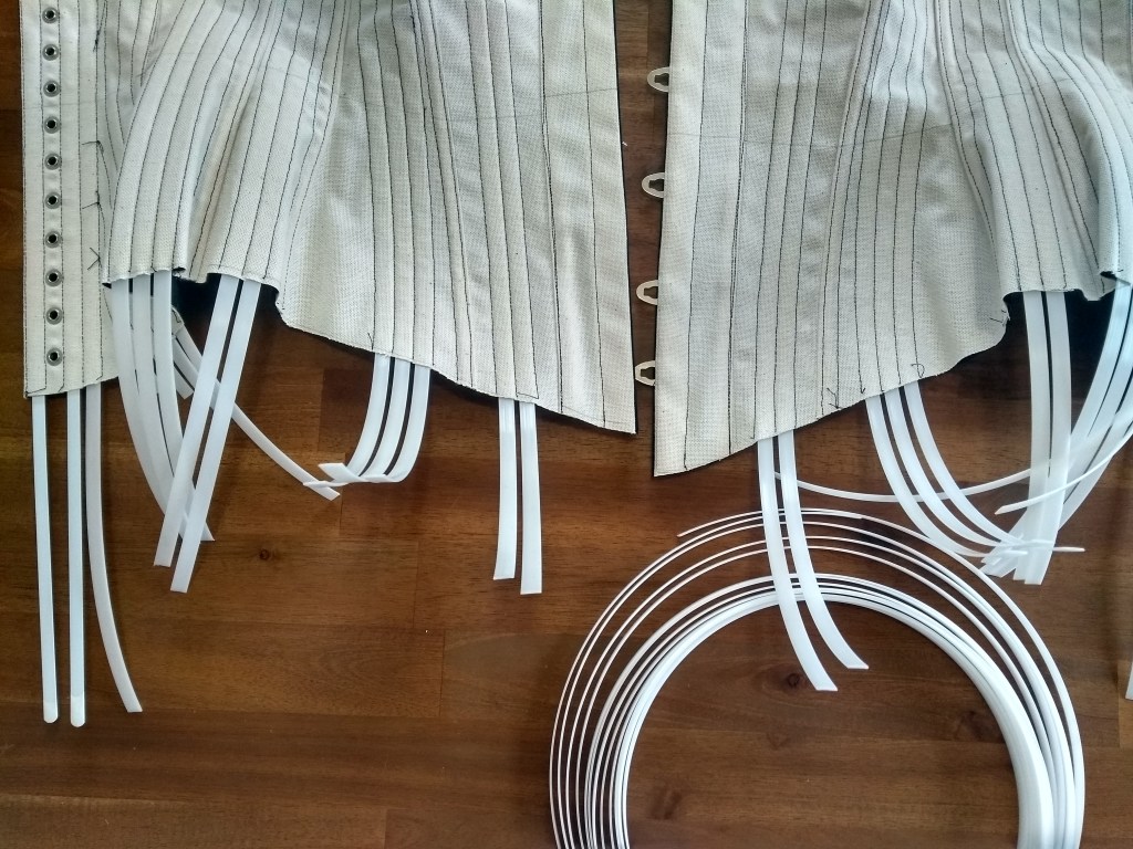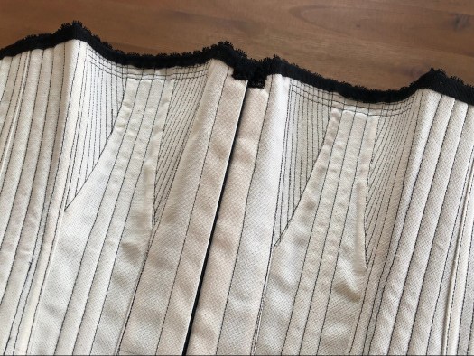Le corset Fenway contient un grand nombre de baleines. La plupart des corsets de cette période en avait beaucoup moins. J’ai d’ailleurs testé mon prototype avec moins d’un tiers des baleines et, la coupe étant tellement ingénieuse, cela aurait pu suffire. J’ai tout de même choisi de mettre autant de baleines que dans le corset original, car je trouve l’effet visuel très élégant. Et puis j’apprécie le confort procuré lorsque les baleines sont nombreuses et se forment à ma morphologie.