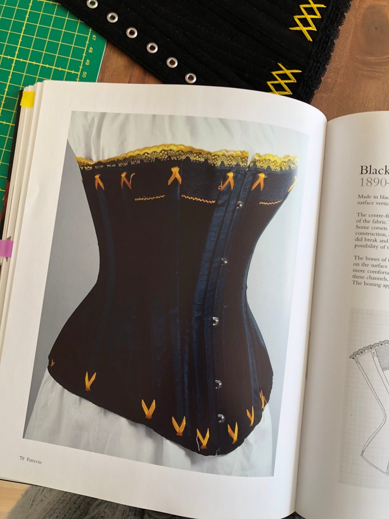 La dernière étape est celle des broderies. Ces décorations très répandues sur les corsets de la seconde moitié du 19ème siècle ont, en plus de l’embellissement, une fonction pratique : elles protègent les extrémités des baleines de l’usure. Je suis tombée plusieurs fois sur des corsets noirs brodés de jaune et datant de cette même époque. Je ne sais pas dans quelle mesure ces couleurs ont été à la mode, en tous les cas ce choix est plausible historiquement et j’aime bien l’effet surprenant de ces couleurs – pas du tout dans la tendance actuelle !