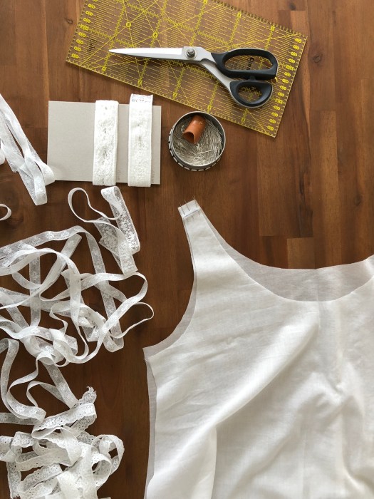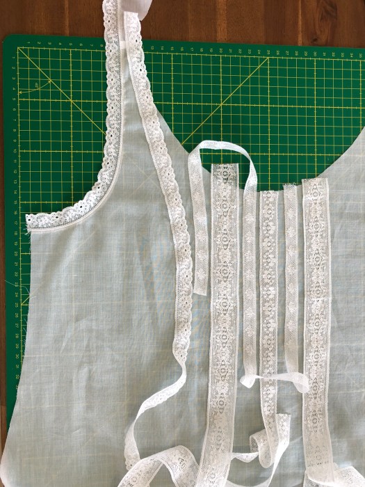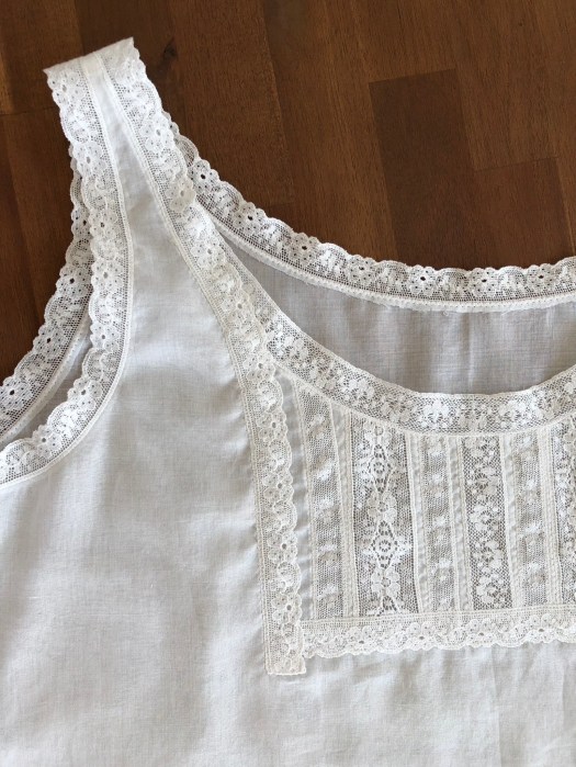 J’ai profité des restes de tissu et de dentelles que j’avais utilisés pour ma combinaison 1910, pour ne pas avoir à acheter de nouveau matériel. J’apprécie toujours autant les insertions de dentelles, c’était un plaisir de m’y remettre.