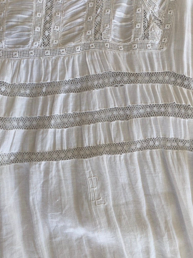 À l’époque, le corset se porte sur une chemise de lin ou de coton, jamais à même la peau. J’en possède une pièce historique, dont les quelques traces d’usure et de raccommodages indiquent que le vêtement a dû être beaucoup porté. Son excellent état et sa solidité témoignent de la qualité inégalable des confections de l’époque. Malheureusement cette chemise est trop grande pour moi (eh oui ! les grandes tailles existaient à l’époque ! Dingue comme on arrive à invisibiliser les femmes grosses même d’il y a 150 ans.) Je me suis inspirée de ce modèle pour m’en confectionner une similaire, à mes mesures.