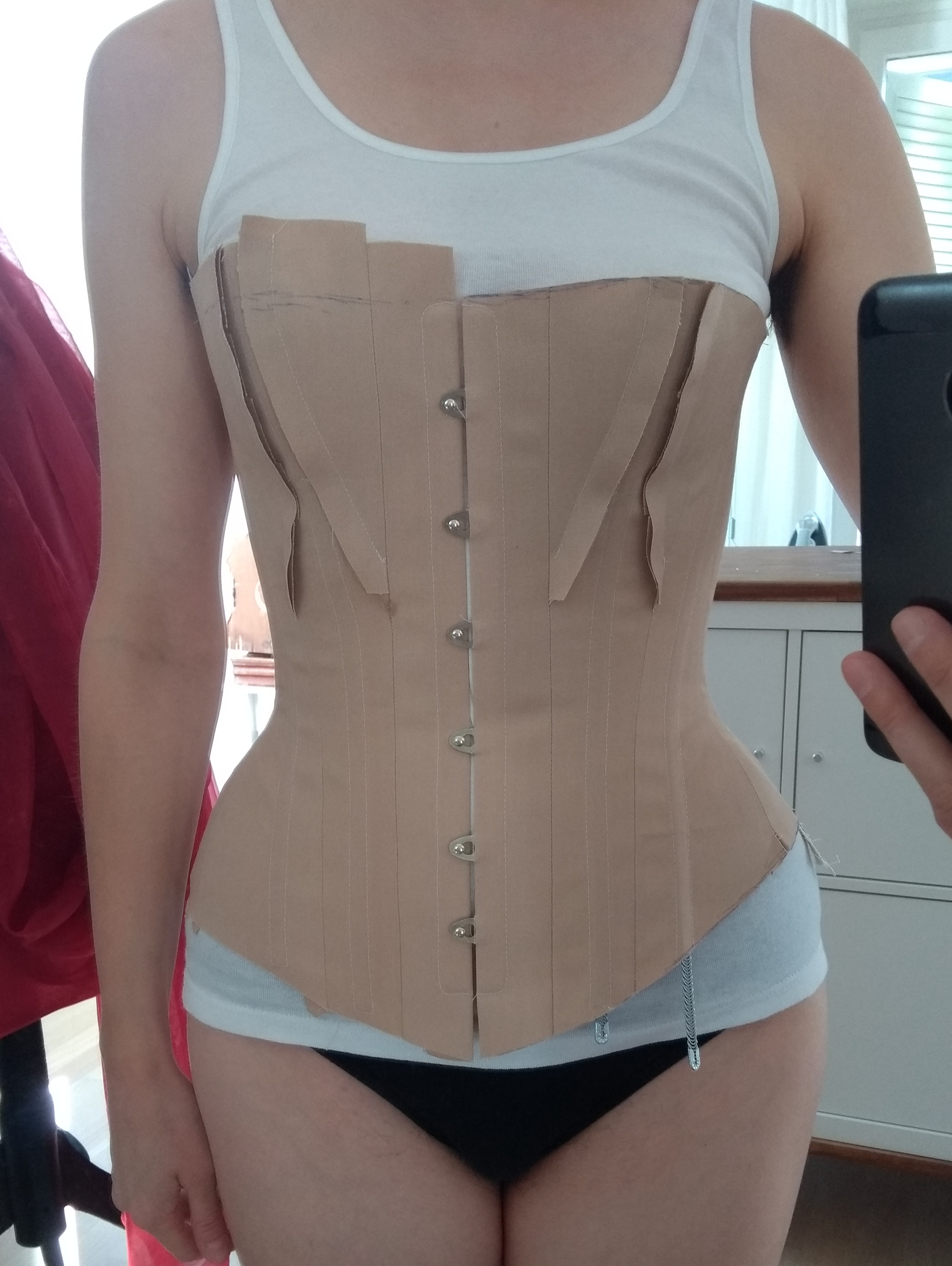 Lors de la reconstitution d’une tenue d’époque, l’un des enjeux majeurs est la coupe, autrement dit, la forme des pièces de tissus qui, une fois assemblées, donneront la silhouette appropriée. Le corset original a été prévu aux mesures de la personne qui l’a porté à l’époque, il faut donc commencer par adapter ces mesures tout en gardant la coupe de référence. C’est toujours un défi et j’adore cette étape, très mathématique, qui consiste à naviguer entre les espaces en 2D du patron à plat et en 3D du corps avec ses courbes. Jusque là, j’avançais beaucoup à tâtonnements. Ce cours m’a permis de comprendre un bon nombre de choses et de faire d’immenses progrès.